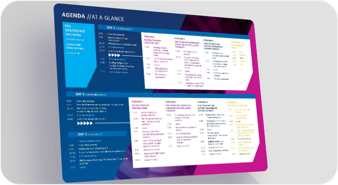 AGENDA // AT A GLANCE PRE- DAY 1 // TUESDAY MAY15 CONFERENCE 9:00 Chairs’ introduction STREAM1 STREAM2 STREAM3 STREAM4 TRAINING 9:15 Selecting thesignificant DIGITALTREASURY: END-TO-END RISKOVERSIGHT: HOW TREASURY CAN LATINAMERICA // MONDAY MAY 14 from thenoise STRATEGICEDGE AROLEFORTHEINTELLIGENT SUPPORT ANDPROMOTE FOCUS 10:00 Makingsenseofachangingworld 11:40 Creating a digital TREASURY? BUSINESSGROWTH 11:40 Brazil CASH FLOW 11:00 Refreshmentbreak roadmap: reaching 11:40 The endlesscyber 11:40 Centralize and 12:20 Argentina FORECASTING 11:40 Conference breaks intostreams tomorrow’streasury problem centralize andcentralize 1:00 Lunch SEE PAGE5 today 12.20 Treasury’stwo-way again Mexico 12:20 SSCthenextgeneration: street: what are you 12:20 Gettingthebestfrom 2:20 3:40 Refreshment break how to make itso worth to your banks? your banks, keeping 3:00 Peru 4:00 Banking oninnovation: 1:00 Lunch Andwhatdoyougetin your optionsopen thefightforfinancialservices 2:20 C2Bconnectivity: return? 1:00 Lunch (on the exhibitionfloor) a difficultdance 1:00 Lunch 2:20 Isyourtreasuryfitfor 5:00 Networkingreception 3:00 The journeyto 2:20 Managing risingrates, change? automation and rising investment 3:00 FX riskmanagement risks 3:00 Refinance or wait? How toplaythetippingpoint DAY 2 // WEDNESDAY MAY16 9:00 Chairs’ introduction STREAM1 STREAM2 STREAM3 STREAM4 9:10 Howdigitalhumansarechangingthefinancialfuture DIGITALTREASURY: END-TO-END RISKOVERSIGHT: HOW TREASURY CAN BEST PRACTICETREASURY 10:00 Navigating taxandotherreforms: STRATEGICEDGE AROLEFORTHEINTELLIGENT SUPPORT ANDPROMOTE 11:20 Best treasuryin Latin areyoumakingtherightchoices? 11:20 Automating KYC:a TREASURY? BUSINESSGROWTH America 10:40 Refreshmentbreak problemshared? 11:20 Centralizing currency –the 11.20 Making M&A makesense 12.00 Best attreasury 11:20 Conference breaks intostreams 12:00 Theoldonesarethebest last great treasury –a role for treasury? transformation ones: solving treasury problem? 12:00 Changingtheratio:howto 12:40 Lunch problems I 12:40 Lunch get more science and less 2:00 Bestatremovingthepain 12:40 Lunch 2:00 Planfortheworst,hopefor art inforecasting from globalcash DAY 3 // THU MAY 17* 2:00 Treasury takes back thebest 12:40 Lunch 2.40 Best maximizingliquidity control? Solvingpayments 3:20 Refreshmentbreak 2:00 Working capital while minimizing cross- issues II 4:00 Changingthefaceofglobal management: how canyou currencyexposure *On the exhibition floor 2:40 Swift GPIversus Ripple cash management, dobetter? 3:20 Refreshmentbreak 9:00 Chairs’ introduction versus Chain: Solving virtually 2:40 Building bridgesfrom 4.00 Bestatsupplychain 9:10 Makingthemostofbanking4.0 payments issuesIII 5:20 Adjourn to day3 business totreasury finance 10:00 Forgettheblockchain, thinkditributed applications 3:20 Refreshmentbreak 3:20 Refreshmentbreak 4.40 Best atworking capital 10:40 Refreshmentbreak 4:00 Choosingtherightsupply 4.00 New technologyworkshop management 11:20 FinTechunravelled: forgetthe theoretical, focus onthe chain solution 5:20 Adjourn to day3 5:20 Adjourn to day3 practical 5:20 Adjourn to day3 12:20 Lunch 4