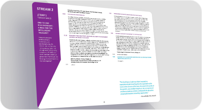 Chaired by: Anne Friberg, CTP, Senior Director, Peer Knowledge Exchange, 2:20 MANAGINGRISINGRATES,ANDRISINGINVESTMENTRISKS STREAM2 The NeuGroup & Senior Contributor,iTreasurer Astheglobal interestratecycleturns,treasurers,especially thosesittingonlarge 11:40 THEENDLESSCYBERPROBLEM cash holdings need to look at their investment strategies. The cash buckets that // DAY 1 According to the two companies, the NotPetya ransomware attacks cost Möller- havemadesenseforadecadeofnearzeroratesmaynotifratesrisequickly. Maersk up to $300 million and Merck’s insurers up to $275 million. Boards are Shortening durationmaycostmoneyupfrontbutitleads tolowerMTMlossesanda TUESDAY MAY15 finally taking notice and have realized that in order to spend appropriately on quicker portfolio response to rate rises. Rising rates imply strengthening economies protection, they need some measure of how much exposure they have. IT and so (often) tightening credit spreads – so is now the time to move out along the departments do not understand risk management and neither do cybersecurity credit curve? The onus still remains with treasury teams to assess investment risks END-TO-END vendors.Buttreasurersdo.Atthesametime,thesecurity andprivacy requirements independently, so which are the best portals or other providers that can help not RISKOVERSIGHT: of the EU’s GDPR directive, with fines of up to 4% of global revenues, are about to just with execution and reporting but also sophisticated analytics to help evaluate become a huge business and compliance problem. Again, treasury has the investment decisions? And is it time to look at unconventional assets and A ROLE FOR THE experience and expertise to help mitigate and manage these risks. So what is best structures? INTELLIGENT practice in these areas? How doyou begin tocalculate potential lossscenarios from 3:00 REFINANCEORWAIT?HOWTOPLAYTHETIPPINGPOINT TREASURY? cyberattacks? Andistreasury therightteamtohelp? USdebtmarketsboomedpartlyoninflowsfromnon-USinvestors runningfromzero 12.20 TREASURY’STWO-WAYSTREET:WHATAREYOUWORTHTOYOURBANKS? and negative yields. But with QE in Europe starting to wind down, and investors Treasury’s standard ANDWHATDOYOUGETINRETURN? hedging against rate rises, that demand for corporate paper may well diminish. At Despitetheadvances intreasury technologyandbankconnectivity, few treasurers the same time, a record $2 trillion of U.S. corporate debt comes due in the next five portfolio of bank have access to a consolidated view of relationships/accounts with their banks and years, with industries such as telecom and energy having especially significant relationship and its value to the bank or the dollar number for annual revenue. And that’s not refinancing needs. Does it make sense to refinance existing facilities now, even if counterparty risk, FX, surprising becausemostbanks donothavereal-timeaccesstothatdataeither. they have two to three years still remaining? What cost-effective hedges are interest rate and liquidity That’saproblem:corporateclients needtoknowhowtheycanmaintain relevance available for those who would rather buy protection against a surprise curve as a client not only to access core products and services, such as credit, FX and steepening than incur the costs of balance sheet restructuring today? And have risk is growing. Cyber risk transaction banking, butalso toensure that theyarehigh upthelistwhenitcomes central banks misreadthesigns–will raterises stallasgrowthslows? management, data privacy to information requests or issue resolution. So how has banks’ view of their Pradipto Bagchi, VP &Assistant Treasurer, Allergan, US compliance, PCI DSS and corporate clients changed as new regulations have become established? How 3:40 REFRESHMENTBREAK more have been added. As transparent are they in revealing their requirements in terms of wallet? And what globalratesrisethough,are cantreasurersdotoensurethattheyremainvaluedrelationships? 4:00 ADJOURNTOTHEEXHIBITIONFLOORFORASPECIALCONVERSATIONON funding and investment risk Steven Vu, Director, Treasury, Prologis, US INNOVATION ANDFINTECH the next bigones? Douglas Tropp, Corporate Treasurer, Booking Holdings Inc., US (See page6.) Mustally Hussain, VP&Treasurer, HercHoldings Inc,US 1:00 LUNCH “The EuroFinance Conference Miami exceeded my expectations by far. Everything from the organization of the event, to the relevance of the topics discussed, to the quality of the speakers, was carefully thought out. Also, an experienced and diverse audience certainly contributed to the discussions and provided excellent networking opportunities.” —MarcusMeirelesVieira,NovaA3 12