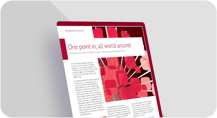 SPONSORED ARTICLE One point in, all world around Midea Group implements Global Account Overview provided by Bank of China. The successfully implemented Global Account Overview Project of the Midea Group Co., Ltd, hereinafter referred to as “Midea Group” in June 2017, marks the new phase of the global cash management cooperation between Bank of China and Midea Group. As a global diversified household appliance enterprise with an integrated industry chain and a small household appliances product group, such as air conditioning, refrigerator and washing machine, Midea Group has a leading position in China. In the early days, Bank of China has built up a close cooperative relationship with Midea Group in domestic cash management. With the transformation to a global enterprise, Midea group urges to create a pathway for domestic and overseas capital and achieve high-efficient global capital centralized, which has become a favorable opportunity centralized collection and payment, cooperation with Bank of China in global for Bank of China to further the cooperation comprehensively satisfying Midea Group’s cash management, Midea Group meets with Midea Group. domestic, cross-border and other business the requirements of capital visibility, requirements. Among them, Global Account capital controllability, capital efficiency Overview as a punch line of realizing global and cash flow optimization, and ultimately accounts visualization, obtained high achieves win-win cooperation between recognition from Midea Group. Midea Group and BOC. Global Account Overview of Bank of China enables Midea Group to set up a customized regional framework according to its globalized strategic layout, monitor the financial status of the global accounts at the same interface and inquire the transaction reports, which highly accords with continuous global outreach of Midea Group. Meanwhile, the accomplishment of Global Account Overview fully presents the strong comprehensive strength and the service advantages of the domestic and overseas integration of Bank of China, and highlights After digging into the customer’s needs for the competitiveness and competence of cash management, Bank of China has paid Bank of China in global cash management. high attention and made a good preparation with quick response. With the integrated operation of BOC group at home and abroad, Bank of China has cooperated efficiently Up to now, Global Account Overview of with Bank of China Hong Kong and other Midea Group has covered 39 enterprises overseas institutions. With a leading and 91 accounts, including the accounts in position in global cash management, Bank Guangdong province, Jiangsu province and of China provides Midea Group with Anhui province in mainland, and five expertise of overseas capital centralized overseas countries and regions, such as from the perspective of global fund visibility, Hong Kong, Indonesia, Vietnam, Austria For more information, visit controllability, operation and multi-currency and the United States. Through the www.bankofchina.com/en