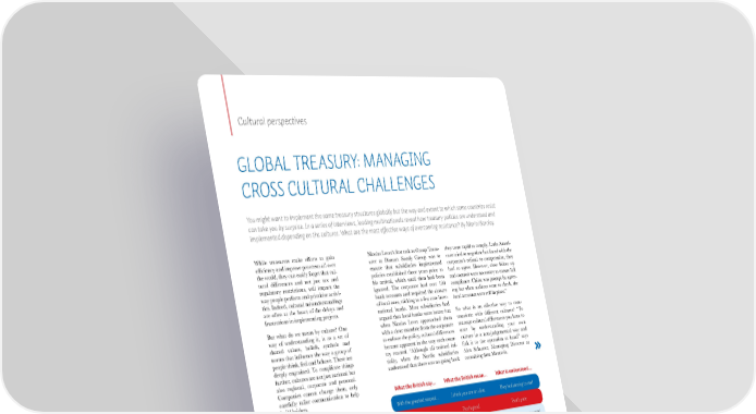 Cultural perspectives GLOBAL TREASURY: MANAGING CROSS CULTURAL CHALLENGES You might want to implement the same treasury structures globally but the way and extent to which some countries resist can take you by surprise. In a series of interviews, leading multinationals reveal how treasury policies are understood and implemented depending on the cultures. What are the most effective ways of overcoming resistance? By Mariel Barclay. While treasurers make efforts to gain Nicolas Levet’s first task as Group Treas- they were rapid to comply. Latin Ameri- efficiency and improve processes all over urer at Damart Somfy Group was to cans tried to negotiate but faced with the the world, they can easily forget that cul- ensure that subsidiaries implemented corporate’s refusal to compromise, they tural differences and not just tax and policies established three years prior to had to agree. However, close follow up regulatory restrictions, will impact the his arrival, which until then had been and controls were necessary to ensure full way people perform and prioritise activi- ignored. The corporate had over 100 compliance. China was prompt in agree- ties. Indeed, cultural misunderstandings bank accounts and required the closure ing but when auditors went to check, the are often at the heart of the delays and of local ones, sticking to a few core inter- local accounts were still in place.” frustrations in implementing projects. national banks. Most subsidiaries had argued that local banks were better but So what is an effective way to com- But what do we mean by culture? One when Nicolas Levet approached them municate with different cultures? “To way of understanding it, is as a set of with a clear mandate from the corporate manage cultural differences you have to shared values, beliefs, symbols and to enforce the policy, cultural differences start by understanding your own norms that influence the way a group of became apparent in the way each coun- culture in a non-judgemental way and people think, feel and behave. These are try reacted. “Although all resisted ini- link it to the operation at hand” says deeply engrained. To complicate things tially, when the Nordic subsidiaries Alex Schuster, Managing Director at further, cultures are not just national but understood that there was no going back consulting firm Mentavis. also regional, corporate and personal. Companies cannot change them, only carefully tailor communication to help What the British say... What the British mean... What is understood... build bridges. The EMEA regional treasurer of a $20 With the greatest respect... I think you are an idiot. They’re listening to me! billion company that prefers to remain That’s not bad. That’s good. That’s poor. anonymous notes: “In Germany people listen and act. In the Middle East they That is a very brave proposal. You are insane! They think I have courage! have a view on how things should be done and I have to listen to them. Although in the end we do what the cor- Very interesting. This is clearly nonsense! They are impressed! porate dictates, I have to adopt different communication styles.” I’ll bear it in mind. I’ve forgotten it already. They will probably do it. Communication is often put to the test by Why do they think cultural resistance when companies I’m sure it’s my fault. It’s totally your fault. it’s their fault? decide to centralise and standardise pro- cesses globally. “If you think that you are I almost agree. I don’t agree at all. They almost agree. going to centralise and everybody is going to fall into line, you are being unrealistic. You must come for Don’t get excited, I am sure I’ll get an A good communication and change man- dinner. I’m just being polite. invitation soon! agement process is fundamental” says Alfredo Elespuru, Corporate Treasurer at Gloria who helped centralise treasury at Belcorp and Oriflame. Subsidiaries typically resist as they see their wallet and their autonomy being taken away. However, reaction and time taken to comply with corporate requirements varies with every culture. Understanding how to build trust and to communicate with each is fundamental to succeed. www.eurofinance.com TREASURY PERSPECTIVES 2017/2018 // 41