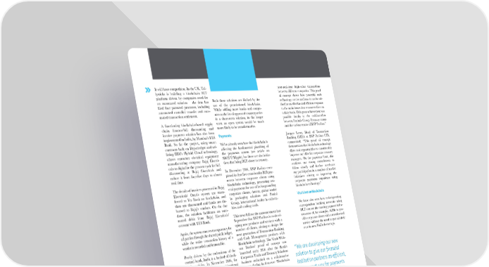 It will have competition. In the UK, Tal- near-real-time high-value transactions lysticks is building a blockchain SCF between different companies. This proof platform driven by companies need for Both these solutions are limited by the of concept shows how powerful such an automated solution – the firm has use of the permissioned blockchain. technology can be and how it can be uti- filed four patented processes, including While adding more banks and compa- lised as an effective and efficient response automated custodial transfer and auto- nies to the list of approved counterparties to the main issues that treasurers face on mated transaction settlement. is a short-term solution, in the longer a daily basis. This great achievement was term an open system would be much possible thanks to the collaboration A functioning blockchain-based supply between Panini’s Group Treasury teams chain finance/bill discounting and more likely to be transformative. and the various teams of BNP Paribas.” invoice payment solution has also been Payments implemented in India, by Mumbai’s YES Jacques Levet, Head of Transaction Bank. So far the project, using smart We’ve already seen how the blockchain is Banking EMEA at BNP Paribas CIB, contracts built on Hyperledger and uti- affecting the fundamental plumbing of commented: “This proof of concept lizing IBM’s Hybrid Cloud technology, the payments system (see article on demonstrates that blockchain technology allows consumer electrical equipment SWIFT/Ripple), but there are also initia- offers real opportunities to considerably manufacturing company Bajaj Electri- tives that bring DLT closer to treasury. improve our offer for corporate treasury cals to digitalise the process cycle for bill managers. On the payments front, this discounting at Bajaj Electricals and In December 2016, BNP Paribas com- confirms our strong commitment to reduce it from four-five days to almost pleted its first live cross-border B2B pay- follow closely and further accelerate real time. ments between corporate clients using our participation in a number of market blockchain technology, processing sev- initiatives aiming at improving the The details of invoices processed in Bajaj eral payments for two of its longstanding corporate payments experience using Electricals’ Oracle system are trans- corporate clients, Amcor, global leader blockchain technology.” ferred to Yes Bank on blockchain, and in packaging solutions and Panini then are discounted and funds are dis- Group, international leader in collecta- Visa’s bet on blockchain bursed to Bajaj’s vendors. On the due bles and trading cards. date, the solution facilitates an auto- We have also seen how re-invigorating mated debit from Bajaj Electricals’ This news follows the announcement last correspondent banking networks using account with YES Bank. September that BNP Paribas is co-devel- DLT can use the existing payment infra- oping new products and services with a structure of, for example, ACHs to pro- Again, the system ensures transparency for number of clients, aiming to design the vide corporate clients with a transformed all parties through the shared public ledger, next generation of Transaction Banking service without the need to put all their while the entire transaction history of a and Cash Management products with trust in new FinTech startups. vendor is recorded and immutable. Blockchain technology. The ‘Cash With- Partly driven by the enthusiasm of the out Borders’ proof of concept was central bank, India is a hotbed of block- launched early 2016 after the Bank’s “We are developing our new chain activity. In November 2016, for Corporate Trade and Treasury Solutions instance, the $17.8 billion multinational business embarked on a collaborative solution to give our financial Mahindra Group and IBM announced process during its first-ever ‘Blockchain institution partners an efficient, that they would co-develop a cloud- Bizhackathon’. based application for tracking supply Using Blockchain technology, BNP Pari- transparent way for payments chain transactions via blockchain. bas successfully processed and cleared to be made across the world.” However, there are certain limitations for Panini Group and Amcor payments with the closed-loop blockchain imple- in various currencies between BNP Pari- mentations that Kannan highlighted by bas bank accounts located in Germany, A similar idea lies behind the joint venture referring to the YES Bank/Bajaj Electri- the Netherlands and the United King- between Visa and Chain, a San Fran- cals case. “We define closed-loop as a dom. The payments were fully processed cisco-based enterprise blockchain infra- private network consisting of one com- and cleared in a few minutes highlighting structure startup. Again, the concept is a pany, one bank, and a set of suppliers. the real potential of this innovative tech- merger of DLT with an existing, trusted Here, in a way, a supplier is forced to dis- nology which eliminates delays, unex- network of banks – in this case Visa’s count his bills with a single bank. He pected fees and processing errors, paving 17,000 banking partners – to help banks might not be banking with the bank as a the way for real time cash management. improve international business-to-busi- supplier or getting better rates else- Panini Group Treasurer, Fabrizio ness payments for their corporate custom- where,” said Kannan. Masinelli said: “Blockchain technology ers. The two companies are currently applied to cross-border payments offers building Visa B2B Connect, a Visa-oper- an innovative way of processing in ated payments system that uses a permis- sioned, private blockchain architecture. The companies claim the system will ena- ble participating financial institutions to quickly process and settle international payments securely with near real-time verification of blockchain technologies. “We are developing our new solution to