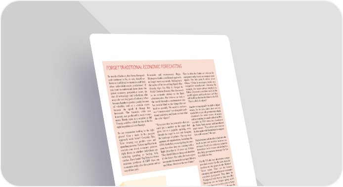 FORGET TRADITIONAL ECONOMIC FORECASTING So much of industry has been disrupted Economist and entrepreneur Pippa Here is what she thinks are relevant for and continues to be, so why should we Malmgren thinks a traditional approach companies today based on common sense listen to traditional economists and their no longer meets our needs. Malmgren is signals. Her first point is advice about often wide-of-the-mark predictions? If the author of the best-selling Signals: How China: “China is no longer a leader as a you want to understand more about the Everyday Signs Can Help Us Navigate the competitive manufacturer. Foxconn, for global economy, geopolitical issues, the World’s Turbulent Economy. She also served example, the largest private employer in rise of technology and tech titans who as an economic advisor to the Bush China (Foxxconn assembles much of the may take over key parts of industry, it has administration. She believes we look at world’s iphone and ipads) have said they become harder to predict, partly because the world through a mathematical lens will build production facilities in the US. of volatility and to a certain extent but remain blind to the things that are That is a hell of a signal.” because the speed of change has hard to quantify. We need to embrace Another strong signal is the shift to digital increased. The financial crisis was our “common sense” eye alongside tradi- money. In the past, when there was too famously not predicted by most econo- tional analytics, and learn to read what much debt to pay off governments simply mists; Brexit came as a surprise as did she calls “signals”. abandoned the whole system of money Trump; and few called the rise of the far and accounting. It sounds radical but Brit- right in politics all over Europe. “Keep your data but remember that you ain did it in 1984 when they abandoned So are economists looking in the right can’t put a number on the anger that the Talley Stick system and introduced places? Can a more fit for purpose gives rise to a populist uprising, even paper money. “You will see governments approach work better? Certainly You- though the anger is real and changing do this again with blockchain in conjunc- Tube viewing can predict votes and the landscape of politics. The top man- tion with e-money,” she says. spending patterns. Twitter and Facebook agement of organisations, including the analysis can reveal economic patterns CEO, think they are navigating the com- Digital money will in effect eliminate the right down to whether individuals are pany but often they are cruising with a black market and therefore increase tax reducing spending or buying baby flight plan that is 10 years out of date. revenues. It will also make tax payments clothes. Even banks’ Big Data is a better They think China is cheap and therefore immediate: both revenue and timing fur- real-time predictor of GDP than any it’s the future. But today the least expen- ther help governments manage the his- economist with a few data points and an sive market for manufacturing is Mexico, toric debt burden. out of date poll. not China. Mexico is the new China.” On the US she says that many compa- nies don’t realise that the most dynamic location on the planet is the Mexico/ Texas region. They are the hottest emerging and industrialised economies anywhere, juxtaposed. They think the Trump wall will destroy that area. But To survive, treasury must reinvent itself To survive, treasury Mexicans are no longer going north as a function that cannot be replicated by because there are so many jobs at home sophisticated algorithms working over must reinvent itself and Americans are happy to fly over the truly integrated, real-time data transfer as a function that wall in search of profit opportunities, and analytics systems. How to start NAFTA or no NAFTA.” thinking about that? Well, it’s an axiom cannot be replicated of AI that computers find the things by sophisticated humans find hard (Big Data analytics) Five second summary easy and the things we find easy (identi- algorithms. If you keep being blindsided by fying a chair) hard. So maybe treasurers events like Brexit and Trump, then stop need to forget about number crunching drilling down into data and instead look and start thinking about becoming for common sense signals. If the Chinese internal change consultants – the link are manufacturing in the US then between an increasingly data-heavy but Shenzhen isn’t cheaper than Wisconsin wisdom-light finance function and the any more. Adjust to that change. If front line businesses. (For detailed uses of governments introduce blockchain in AI in finance, see page 10.) sync with e-money, expect that the debt will become easier to manage. Five second summary AI and automation will be adopted to cut staffing costs. To avoid redundancy So are economists looking in reinvent yourself as a value-added the right places? Can a more human to human interface. fit for purpose approach work better? www.eurofinance.com TREASURY PERSPECTIVES 2017/2018 // 9